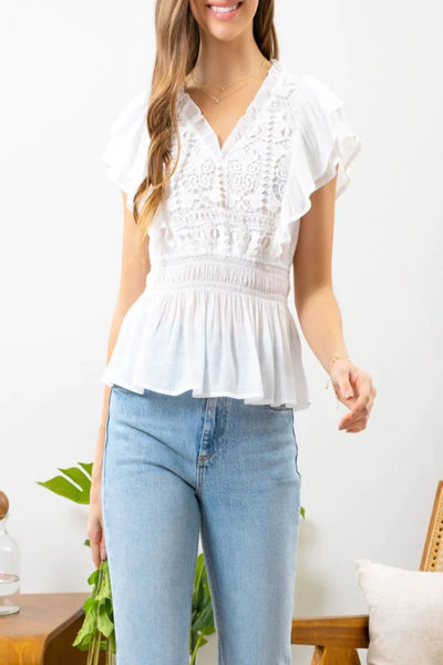 This pink top features lace details, a smocked waist, and flowy sleeves. Can be dressed up or down!