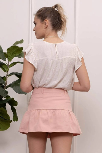 A light weight, flowy top with a lace design and flutter sleeves. Features a button closure at the back in beautiful shade of mint green!